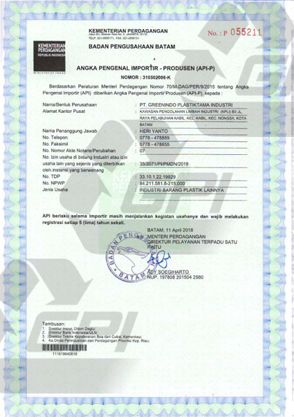Dokumen pengesahan hukum yang menunjukkan bahwa PT. Greenindo Plastiktama Industri adalah perusahaan berbadan hukum yang sah.